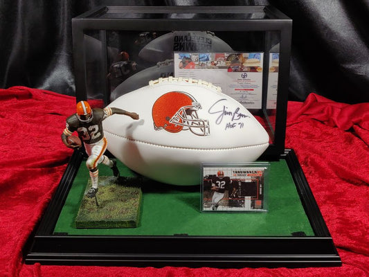 Jim Brown Autographed Football Browns Shadowbox w/ Jersey Card & Figure