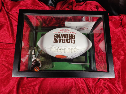 Jim Brown Autographed Football Cleveland Browns Shadowbox w/ Card & Figure