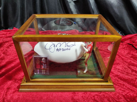 Joe Montana Signed Football Shadowbox 49ers HOF/SB MVP Ball w/ Card & Figure