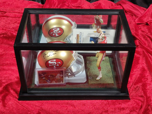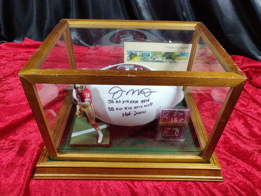 Joe Montana Signed Mini Helmet Shadowbox 49ers HOF 2000 w/ Card & Figure