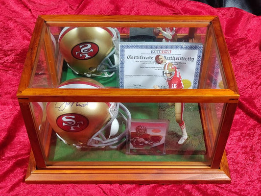 Joe Montana Signed Mini Helmet Shadowbox 49ers w/ Jersey Card & Figure Tristar