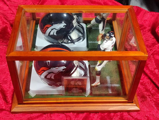 John Elway Signed Mini Helmet Shadowbox 9x10x15 Broncos w/ Card & Figure