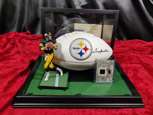 Terry Bradshaw Steelers Autographed Football Shadowbox with Card and Figure