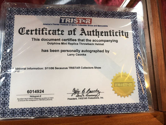 Larry Csonka Dolphins Certified Authentic Autographed Mini-helmet Shadowbox