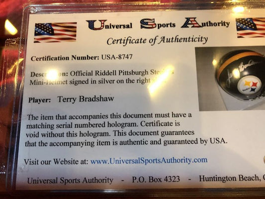 Terry Bradshaw Steelers Signed Mini Helmet Shadowbox w/ GU Card & Figure COA