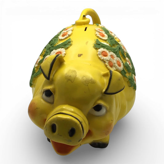 1976 Yellow Floral Hard Plastic Piggy Bank - Universal Statuary Corp