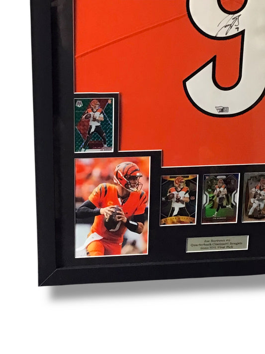 Framed Nike Joe Burrow Custom Signed Jersey Fanatics Certified w/ 4 Rookie cards 1 Insert