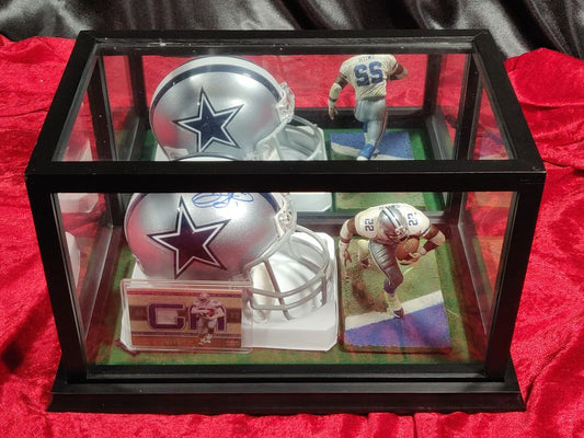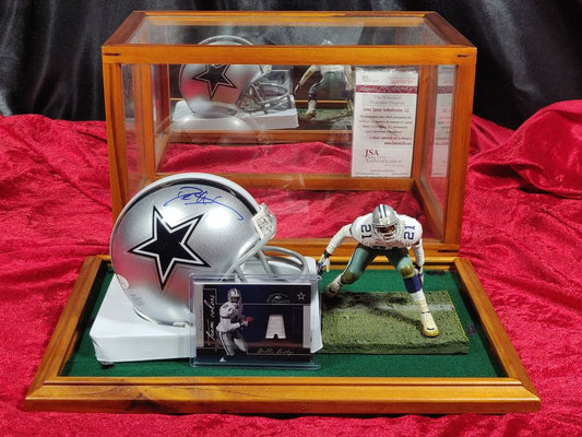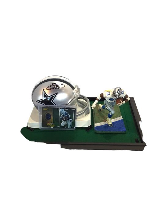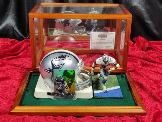Emmitt Smith Autographed Mini Helmet Shadowbox Cowboys w/ Jersey Card + Figure