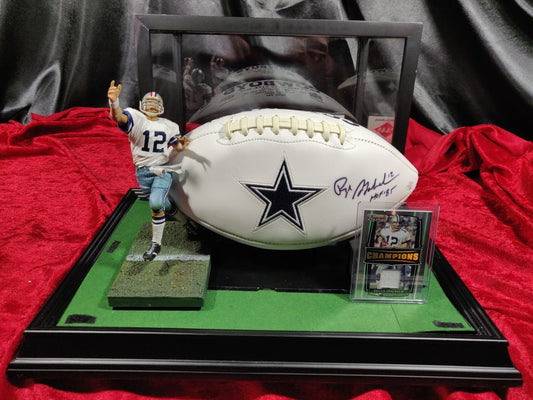 Roger Staubach Dallas Cowboys Autographed Football Shadowbox with Card & Figure