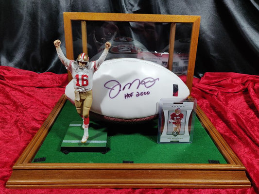 Joe Montana 49ers Autographed Football Shadowbox with Card and Figure