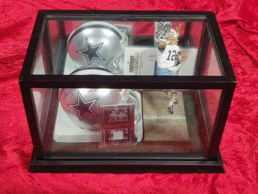 Roger Staubach Cowboys Autographed Mini Helmet Shadowbox w/ Jersey Card + Figure