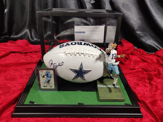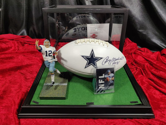 Roger Staubach Dallas Cowboys Autographed Football Shadowbox with Card & Figure