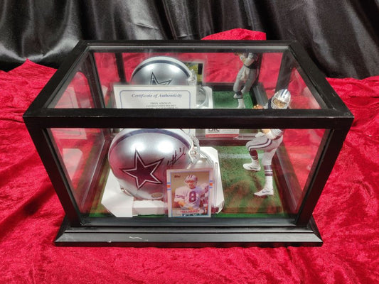 Troy Aikman Cowboys Autographed Mini Helmet Shadowbox w/ Rookie Card + Figure