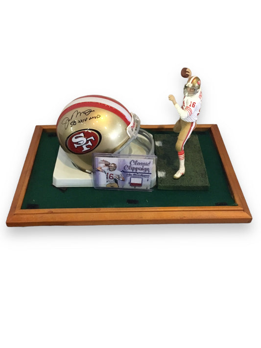Joe Montana 49ers Autographed Mini Helmet Shadowbox w/ Jersey Card and Figure