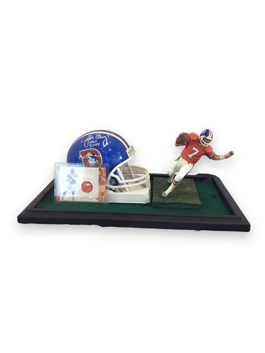 John Elway Broncos Autographed Mini Helmet Shadowbox w/ Jersey Card and Figure