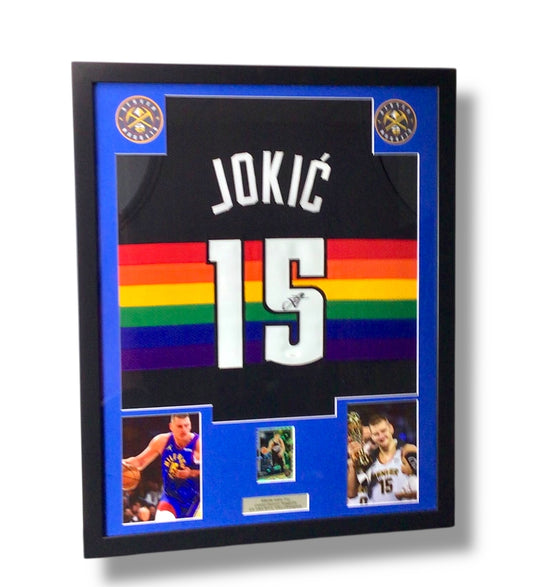 Custom Framed Nikola Jokic Signed Jersey w/ JSA Cert & Donruss Optic Insert Card