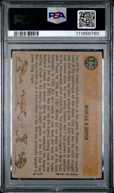 1960 Topps Rival All Stars #160 Mantle & Boyer PSA 2(MK) Nice Centering!