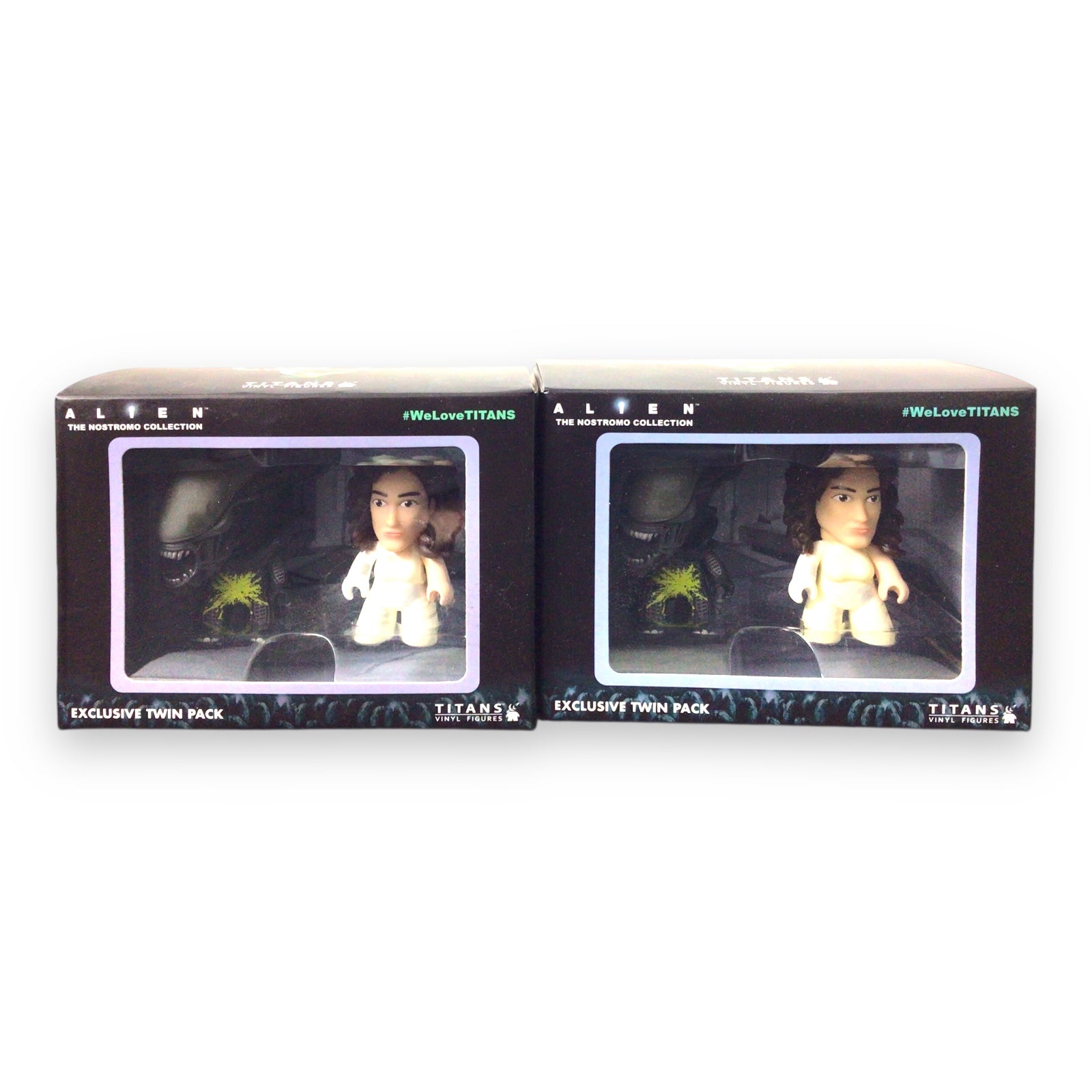 Two Titan Vinyl Figures twin packs from the Alien: The Nostromo Collection line. Each boxed set includes Ripley and a Big Chap Alien, styled in Titan's signature caricatured format. The packaging features character art and branding, making these a standout pair for horror or sci-fi collectors.