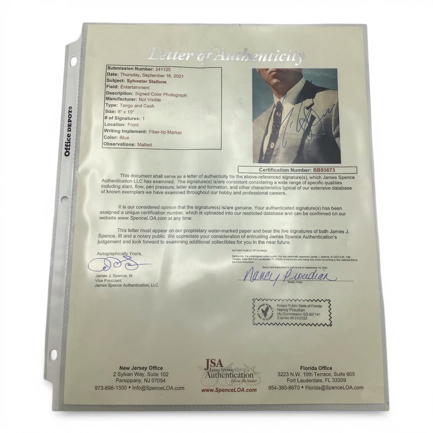 Own a piece of Hollywood history with this authenticated 8x10 photograph of Sylvester Stallone. Professionally framed and certified by JSA (James Spence Authentication), this collectible captures an iconic moment of the legendary action star. Perfect for fans and serious collectors alike, this display-ready piece brings cinematic prestige to any room. A genuine investment in entertainment memorabilia.