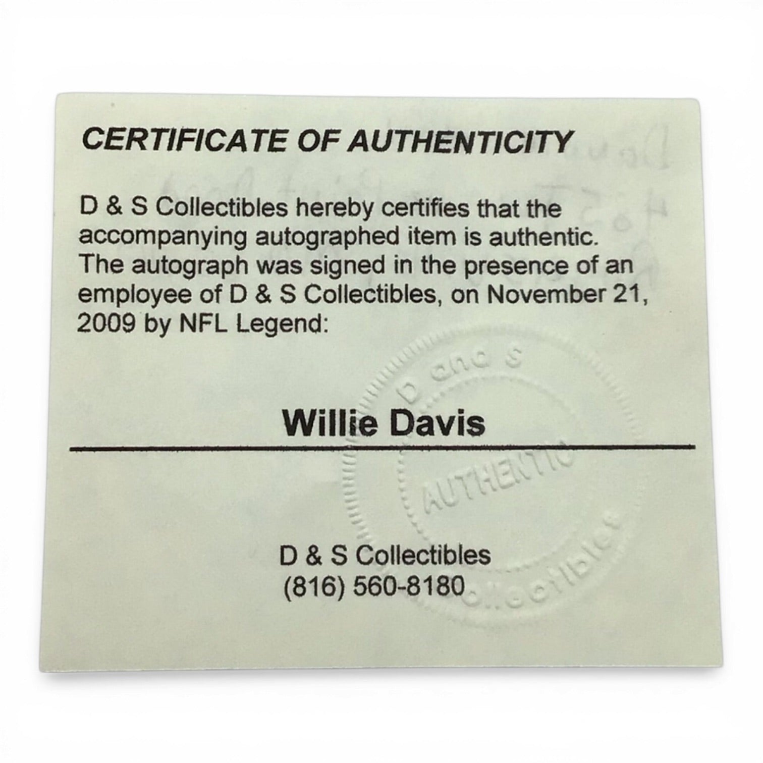Celebrate a piece of football history with this authentic framed Willie Davis signed photo. The legendary defensive end's signature is prominently displayed on a professional-quality print, making it an ideal centerpiece for any sports memorabilia collection. Perfect for fans of classic NFL greatness, this framed piece combines nostalgia with timeless appeal. A wonderful addition to your home, office, or man cave that honors one of the game's most respected defensive players.