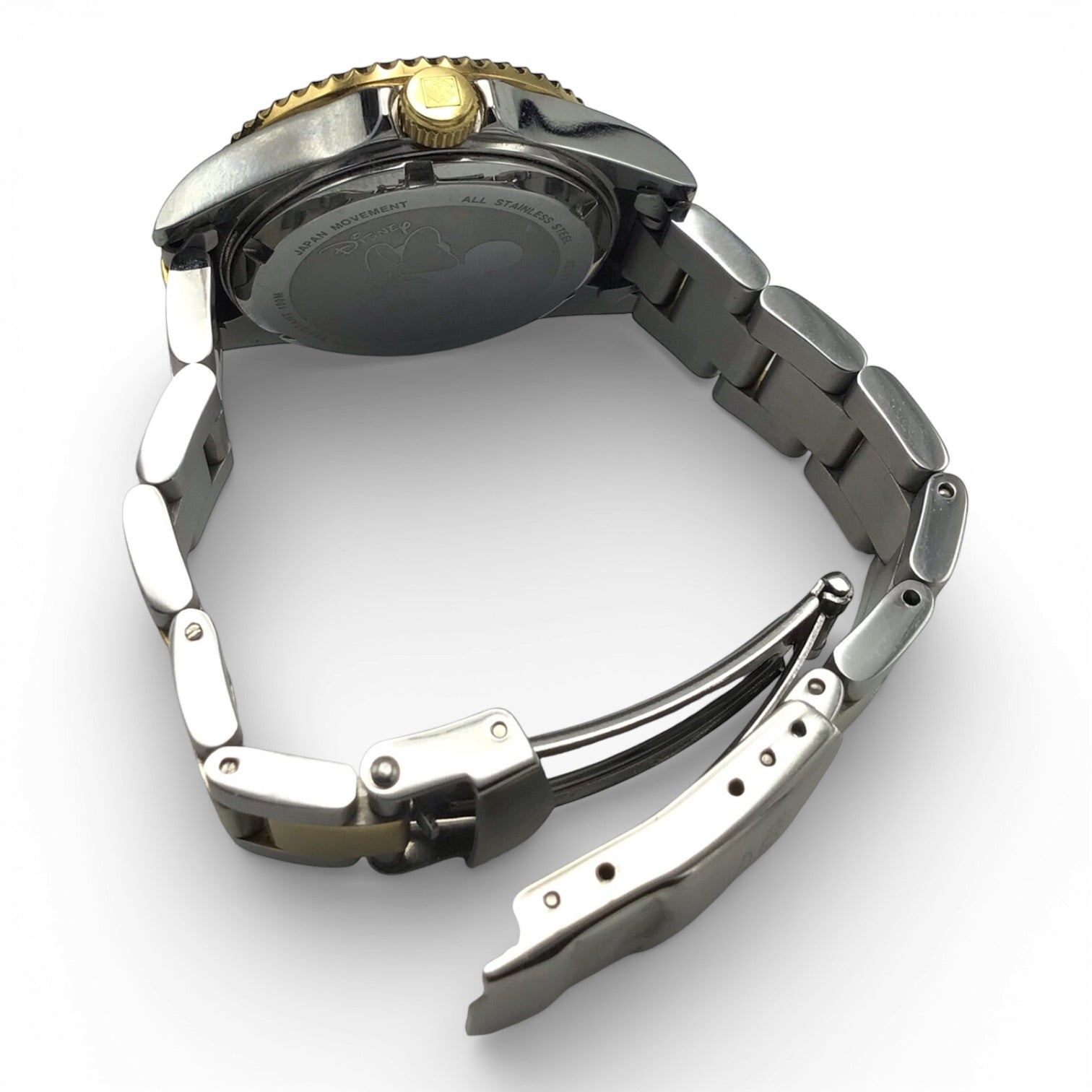Celebrate timeless elegance with this Invicta Disney Limited Edition Minnie Mouse women's watch. Featuring a precise quartz movement and a stunning 34mm two-tone steel and gold case, this timepiece combines classic Disney charm with sophisticated craftsmanship. The gold metal dial is protected by durable mineral crystal, while the matching steel and gold stainless steel band ensures comfort and style. Water-resistant to 100 meters, it's perfect for everyday wear and special occasions alike. Arrives in original packaging with warranty documentation included.