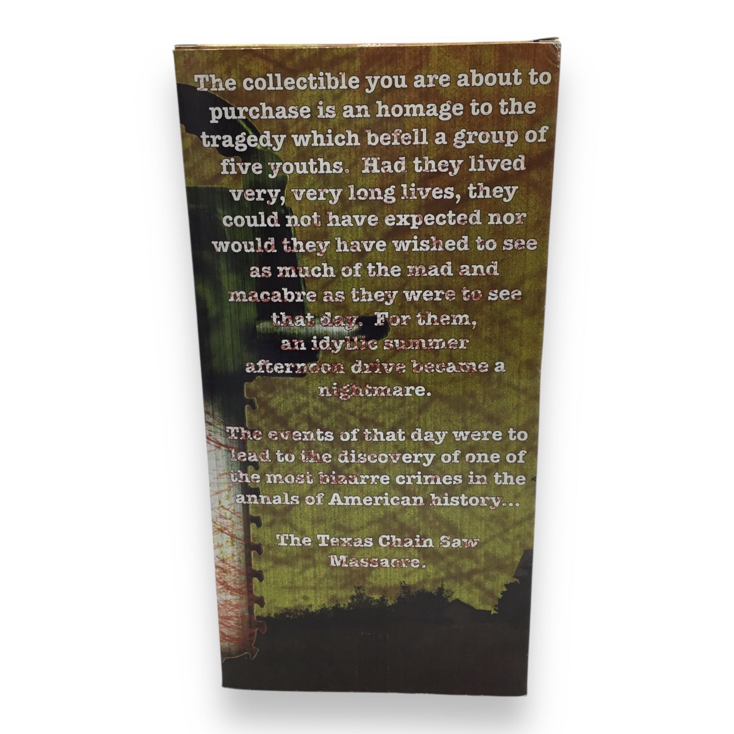 The collectible you are about to purchase is an homage to the tragedy which befell a group of five youths. Had they lived very, very long lives, they could not have expected, nor would they have wished to see as much of the mad and macabre as they were to see that day. For them, an idyllic summer afternoon drive became a nightmare. The events of that day were to lead to the discovery of one of the most bizarre crimes in the annals of American history... The Texas Chain Saw Massacre.