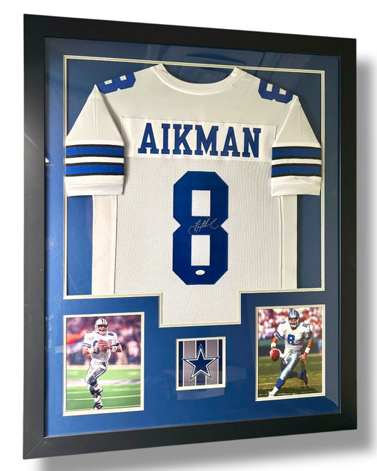 Framed Troy Aikman Autographed Jersey w/ JSA Authentication & 2 Action Photos